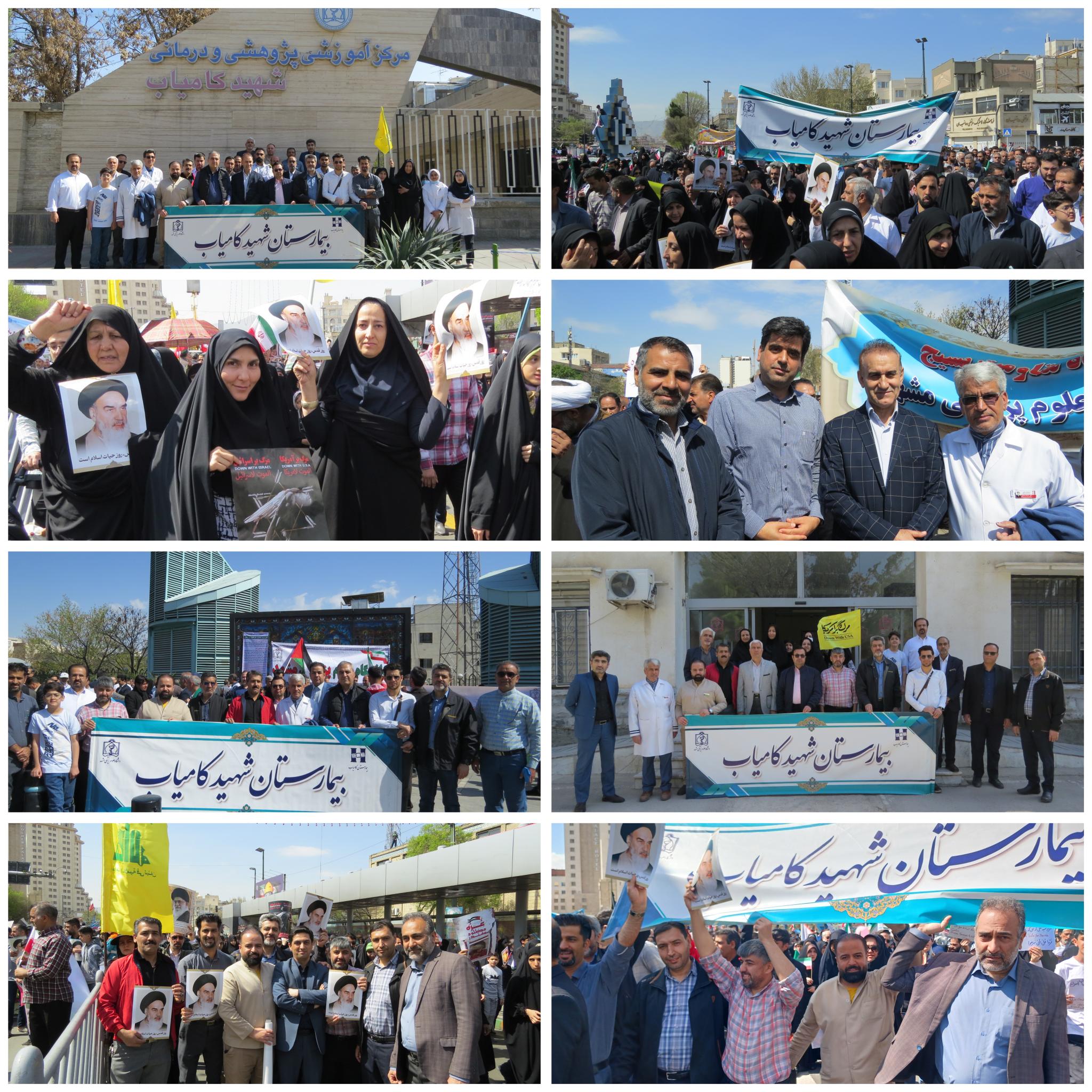 در این راهپیمایی که جمعی از پرسنل شریف و مسئولین ولایتمدار و همیشه در صحنه بیمارستان شهید کامیاب حضور داشتند ، دیگر بار خروش قهرمانانه خود را علیه اشغالگران غاصب قدس به نمایش گذارده و همگام و همدوش با هموطنان و سایر ملت های مسلمان دنیا با فریادهای مستحکم، آزادی قدس شریف را خواستار شدند .