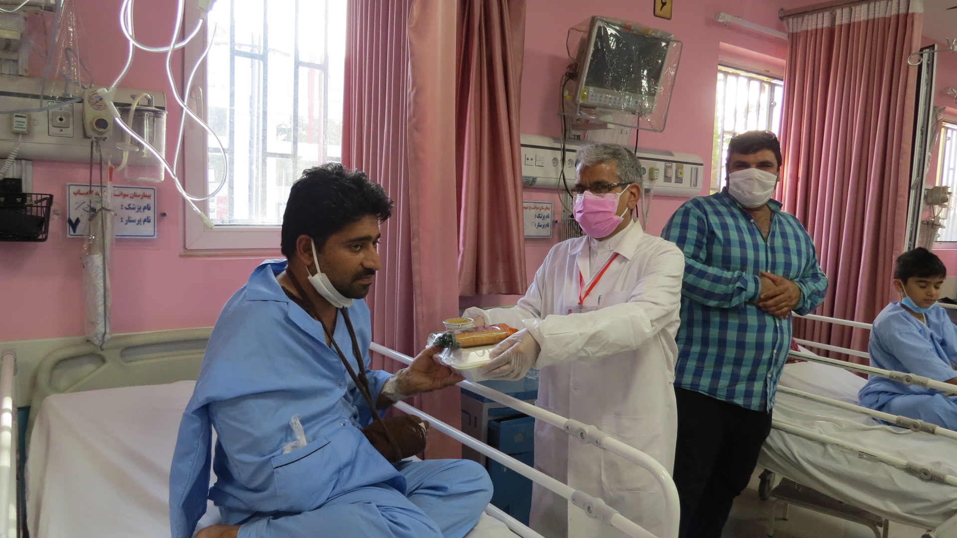خدام حضرت رضا (ع) ضمن مداحی و قرائت صلوات خاصه حضرت رضا(ع) ، غذای تبرکی آن حضرت را به بیماران و کارکنان در چهاردهمین روز از ماه مبارک رمضان اهدا کردند .