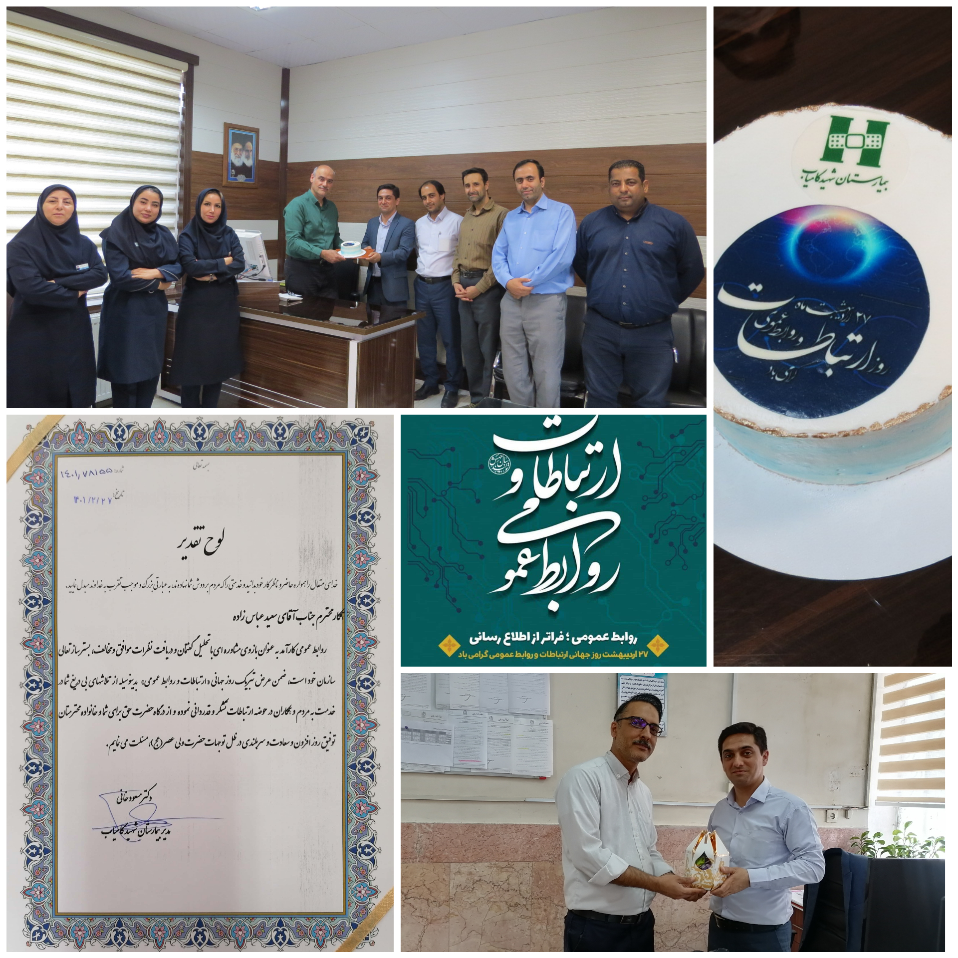 صبح امروز بمناسبت 27 اردیبهشت ماه روز جهانی "ارتباطات و روابط عمومی ، دکتر مسعود خانی مدیریت محترم بیمارستان شهید کامیاب به همراه جمعی از مسئولین مرکز از مسئول روابط عمومی بیمارستان با اهداء کیک و لوح تقدیر به نشانه سپاس قدردانی و این روز را گرامی داشتند .
